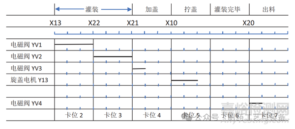 撥桿工作子程序?qū)?yīng)圓盤卡位 1 工作內(nèi)容;注藥液1子程序?qū)?yīng)圓盤卡位2工作內(nèi)容;注藥液2子程序?qū)?yīng)圓盤卡位3工作內(nèi)容;加蓋子程序?qū)?yīng)圓盤卡位 4 工作內(nèi)容;旋蓋子程序?qū)?yīng)圓盤卡位5工作內(nèi)容;卡位6沒有灌裝任務(wù),無子程序;出料子程序?qū)?yīng)圓盤卡位 7 工作內(nèi)容,灌裝圓盤一共有 8 卡位,如圖11 所示為灌裝藥液各卡位工序流程圖。圖中,卡位 1 為灌裝上料口;卡位 2 電磁閥 V1控制加藥液 1;卡位 3電磁閥 V2控制加藥液2;卡位 4 電磁閥 V3 控制推管加蓋;卡位 5 電機控制擰蓋;卡位6灌裝完畢;卡位7電磁閥V4控制推管將藥瓶推進檢測傳送帶。要實現(xiàn)多瓶藥品連續(xù)灌裝,初始化時需要從第一步依次執(zhí)行到第六步,之后一直循環(huán)至第六步。