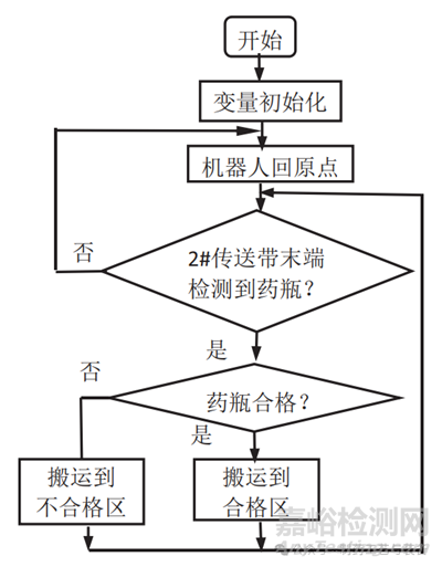 機器人的控制方式采用外部端子,PLC4個輸出點組合起來對應(yīng)機器人的16個點位(狀態(tài)),如表1 所示,未在表中列出的為備用點。工作過程中,機器人等待上料,判斷藥瓶是否合格,若到料,機器人到取料點,取料氣缸啟動,吸盤氣缸啟動,吸取物料,機器人搬放物料,復(fù)位。軟件設(shè)計上,使用計數(shù)器 C3 統(tǒng)計不合格數(shù)量,計數(shù)器 C4 統(tǒng)計合格數(shù)量,并且每個搬運工作都編寫 1個子程序。機器人搬運工序流程圖如圖12所示。
