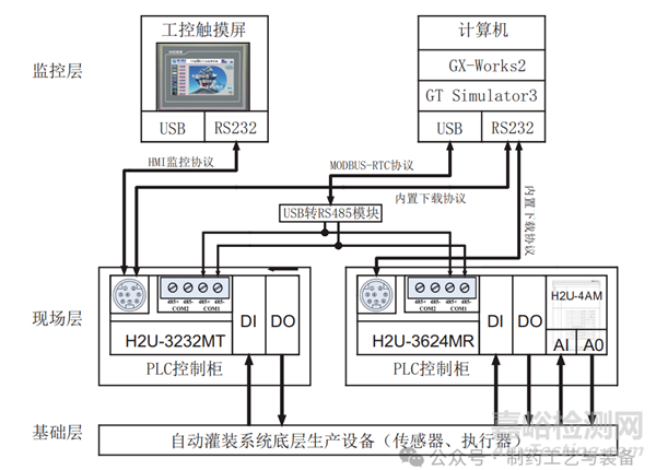 圖2為藥品自動灌裝系統(tǒng)的控制方案圖。藥品自動灌裝系統(tǒng)的總體方案架構(gòu)分為三層:基礎(chǔ)層、現(xiàn)場層、監(jiān)控層。基礎(chǔ)層是構(gòu)成現(xiàn)場信號采集和控制指令執(zhí)行的最底層的網(wǎng)格單元,主要由傳感器、執(zhí)行機構(gòu)等構(gòu)成;現(xiàn)場層的核心是 PLC,其作用是接收監(jiān)控層下達的指令并下達給基礎(chǔ)層的相關(guān)執(zhí)行機構(gòu),同時將基礎(chǔ)層傳感器檢測的信號反饋傳遞給監(jiān)控層,監(jiān)控層根據(jù)反饋的信號數(shù)據(jù)作出對應(yīng)的判斷并下達相應(yīng)指令。現(xiàn)場層的各模塊PLC之間通過RS-485總線進行數(shù)據(jù)通信,實現(xiàn)信息互換。監(jiān)控層以工控觸摸屏(如昆侖通態(tài)、威綸通等)為核心,通過 RS-232 總線與現(xiàn)場層的RS-232接口進行實時通信,從而對系統(tǒng)進行可視化管理[4]。另外,現(xiàn)場層的 RS-232 接口也可以接到電腦端,通過三菱 PLC 編譯軟件 GX-Works2 進行程序設(shè)計,實現(xiàn)在線監(jiān)控和修改,如傳送帶速度調(diào)節(jié)、藥液閥調(diào)節(jié)、比例及積分參數(shù)調(diào)節(jié)等。