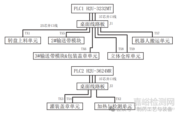控制系統(tǒng)中選用了兩個 PLC,第一個 PLC 型號是H2U-3232MT,它主要控制轉(zhuǎn)盤上料單元、傳送帶單元、包裝蓋章單元、機器人搬運單元、立體倉庫單元。它的 3 路高速輸出恰好可以控制 2 路步進電機驅(qū)動和 1 路伺服脈沖;第二個 PLC 型號是H2U-3624MR,它主要控制灌裝加蓋單元、加熱與檢測單元。