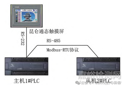 在觸摸屏與主站1#PLC之間采用了匯川的下載監(jiān)控協(xié)議進行通信,物理接口是 RS-232 接口,工作方式是全雙工,這樣可以極大地提高PLC1與觸摸屏之間的傳輸速率,數(shù)據(jù)更新和采集也更快。1#PLC 與 2#PLC 之間的網(wǎng)絡(luò)架構(gòu)是 RS-485 主從架構(gòu),工作方式是半雙工。RS-485通信端口采用差分信號傳輸方式,具有抗干擾能力強、通信距離遠、通信速率高等優(yōu)點。系統(tǒng)使用的通信協(xié)議是Modbus-RTU協(xié)議。系統(tǒng)通信網(wǎng)絡(luò)如圖4所示,通信配置如圖5、圖6所示。