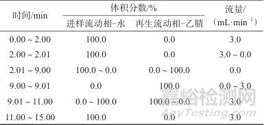 在線固相萃取柱:Oasis HLB Direct Connect HP固相萃取柱(30 mm×2.1 mm,20 μm,美國沃特世科技有限公司);進(jìn)樣體積:2 mL;流動(dòng)相:水,流量為3 mL/min;進(jìn)樣時(shí)間:2 min;SPE柱再生流動(dòng)相:乙腈,流量為3 mL/min。在線固相萃取條件見表1。