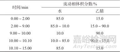 色譜柱:Shim-pack GIST C18柱(100 mm×2.1 mm,2 μm,日本島津公司);流動(dòng)相:A相為水,B相為乙腈,流量為0.25 mL/min;柱溫:40 ℃;洗脫方式:梯度洗脫,洗脫程序見表2。