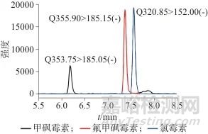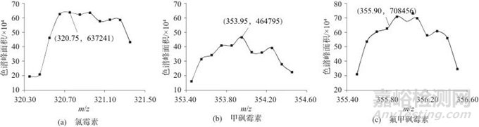 用初始流動(dòng)相稀釋氯霉素、甲砜霉素和氯甲砜霉素,分別配制成質(zhì)量濃度為50 ng/mL的3種氯霉素標(biāo)準(zhǔn)溶液,對(duì)每個(gè)標(biāo)準(zhǔn)溶液進(jìn)行質(zhì)量數(shù)掃描,結(jié)果見圖1,根據(jù)不同質(zhì)量數(shù)所獲得信號(hào)強(qiáng)度的峰值位置,選擇出氯霉素、甲砜霉素和氟甲砜霉素3種氯霉素的前體離子最優(yōu)質(zhì)荷比(m/z)分別為320.75、353.95、355.90。