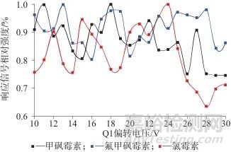 圖3 不同Q1偏轉(zhuǎn)電壓條件下3種氯霉素的響應(yīng)信號(hào)相對(duì)強(qiáng)度值