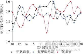 圖3為3種氯霉素在不同的Q1偏轉(zhuǎn)電壓下獲得的信號(hào)強(qiáng)度,利用信號(hào)強(qiáng)度峰值所在的Q1偏轉(zhuǎn)電壓范圍獲得3種氯霉素的最優(yōu)Q1偏轉(zhuǎn)電壓參數(shù),由此得到氯霉素、甲砜霉素和氟甲砜霉素3種氯霉素的偏轉(zhuǎn)電壓Q1最優(yōu)值分別為24、18、13 V。