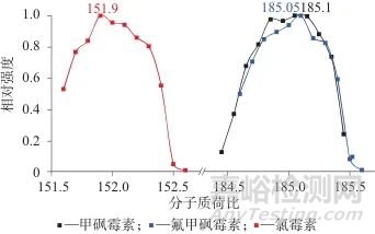 對(duì)3種氯霉素標(biāo)樣進(jìn)行測(cè)試,最終對(duì)信號(hào)離子收集分析時(shí),除母體離子之外,經(jīng)過Q2碰撞反應(yīng)后的產(chǎn)物離子是進(jìn)行濃度測(cè)定的必要物質(zhì)。圖5為不同荷質(zhì)比條件下3種氯霉素的相對(duì)強(qiáng)度值。通過對(duì)信號(hào)強(qiáng)度峰值的質(zhì)量數(shù)掃描范圍確定對(duì)產(chǎn)物離子進(jìn)行分析的最佳質(zhì)荷比(m/z),氯霉素、甲砜霉素和氯甲砜霉素的產(chǎn)物離子最優(yōu)質(zhì)荷比分別為151.90、185.05、185.10。
