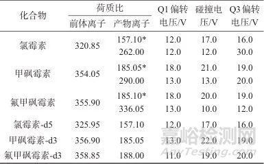 進(jìn)行數(shù)據(jù)分析之后發(fā)現(xiàn)碰撞電壓對(duì)靈敏度有較大影響,偏轉(zhuǎn)電壓Q1、偏轉(zhuǎn)電壓Q3等影響較小。在此基礎(chǔ)上建立多反應(yīng)監(jiān)測(cè)(MRM)采集模式,3種氯霉素的MRM采集最佳參數(shù)見表3。