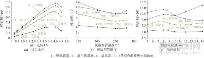 在液相色譜-質(zhì)譜檢測(cè)方法中,離子源參數(shù)對(duì)方法靈敏度也有較大影響。分別對(duì)離子源接口電壓、接口溫度、脫溶劑管溫度等參數(shù)進(jìn)行優(yōu)化,不同參數(shù)下的色譜峰面積如圖6所示。最終確認(rèn)離子源最佳參數(shù)為:接口電壓4 kV (負(fù)離子模式),接口溫度400 ℃,脫溶劑管溫度150 ℃。
