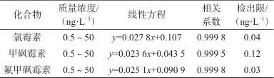 分別稱取氯霉素、甲砜霉素、氟甲砜霉素1 mg置于同一容量瓶中,用10 mL乙腈稀釋,配制混合工作液,取混合工作液用乙腈以逐級(jí)稀釋配制系列混合標(biāo)準(zhǔn)工作溶液,其中氯霉素、甲砜霉素、氟甲砜霉素的質(zhì)量濃度均分別為0.5、1、2、5、10、20、50 μg/L。在超純水中按照1∶1 000的比例加入上述內(nèi)標(biāo)工作液及系列混合標(biāo)準(zhǔn)工作溶液,其中氯霉素、甲砜霉素、氟甲砜霉素溶液各組分質(zhì)量濃度均分別為0.5、1、2、5、10、20、50 ng/L,內(nèi)標(biāo)溶液各組分質(zhì)量濃度均為10 ng/L。