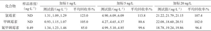 在最優(yōu)的質(zhì)譜條件下,以各目標(biāo)物質(zhì)量濃度為橫坐標(biāo),目標(biāo)物峰面積與內(nèi)標(biāo)峰面積的比值為縱坐標(biāo),采用內(nèi)標(biāo)法繪制標(biāo)準(zhǔn)曲線,3種化合物的線性范圍、線性方程、相關(guān)系數(shù)、檢出限、見表4。由表4可見,在0.5~50 ng/L濃度范圍內(nèi)線性關(guān)系良好,線性相關(guān)系數(shù)均大于0.999 5,以3倍信噪比確定檢出限,獲得氯霉素類抗生素的最低檢出限為0.03~0.12 ng/L。比較其他方法測(cè)定環(huán)境水質(zhì)中氯霉素類抗生素的文獻(xiàn)方法,該方法的靈敏度有很大程度提高,可以應(yīng)用于實(shí)際環(huán)境樣品痕量氯霉素類抗生素的監(jiān)測(cè)[25]。