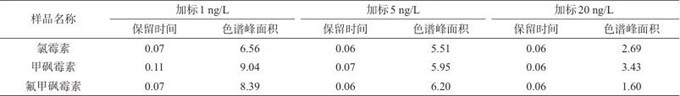 對(duì)低、中、高3個(gè)質(zhì)量濃度(1、5、20 ng/L)的氯霉素混合標(biāo)準(zhǔn)溶液連續(xù)測(cè)定8次,考察分析方法保留時(shí)間和色譜峰面積的相對(duì)標(biāo)準(zhǔn)偏差,結(jié)果見表6。由表6可見,氯霉素類抗生素的保留時(shí)間和色譜峰面積測(cè)試值的相對(duì)標(biāo)準(zhǔn)偏差分別不超過0.11%和9.04%,表明方法精密度高。