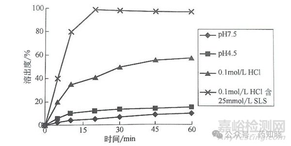 溶解度極低的藥物通常采用添加表面活性劑或酶促進(jìn)藥物的溶解。溶出方法中常用的表面活性劑包括十二烷基硫酸鈉(SLS)、聚山梨酯、十六烷基三甲基溴化銨(CTAB)或曲拉通(Triton)等,其中,SLS是最常用的表面活性劑。通常表面活性劑的加入量通過(guò)漏槽條件進(jìn)行考察。如表面活性劑過(guò)量,溶出方法可能會(huì)掩蓋藥物多晶型或粒徑的變化的影響。