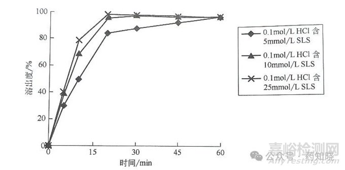 因含25mmol/LSLS的0.1mol/LHCl介質(zhì)中藥物釋放過(guò)快,溶出過(guò)程的區(qū)分性不夠明顯,因此降低SLS的濃度進(jìn)行考察。