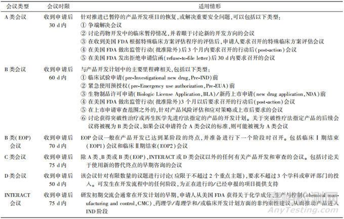 《處方藥使用者付費法案》(Prescription Drug User Fee Act,PDUFA)建立了在創(chuàng)新藥研究開發(fā)和審評過程中美國FDA與申請人溝通交流的正式會議制度,設(shè)置了A類會議、B類會議、B類[階段結(jié)束(end of phase,EOP)]會議、C類會議、D類會議和初步監(jiān)管建議(initial targeted engagement for regulatory advice on CBER/CDER producTs,INTERACT)會議。《FDA與PDUFA產(chǎn)品的申請人之間的正式會議》為美國FDA與創(chuàng)新藥和生物制品的申請人之間的正式會議提供了行業(yè)指南規(guī)范[4]。以上6種會議的類型、時限和適用情形見表1。