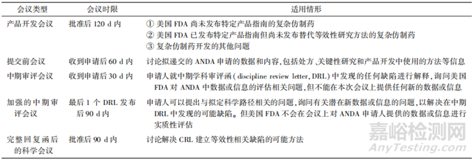 GDUFA會議分為產(chǎn)品開發(fā)會議(product devel?opment meetings)、提交前會議(pre?submission meetings)、中期審評會議(mid?cycle review meetings,MCRM)、加強的中期審評會議(enhanced mid?cycle review meetings,EMCRM)以及完整回復(fù)函后的科學(xué)會議[post?complete response letter(CRL)scientif?ic meetings]5種。其中,對于MCRM和EMCRM而言,美國FDA在第1個評估周期中僅會批準其中1種會議申請,而不會同時批準這2種會議。GDUFA的會議類型、時限和適用情形見表2。