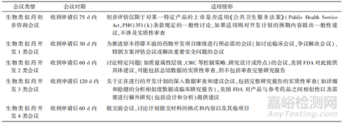 作為《生物類似藥使用者付費法案》(Biosimilar User Fee Act,BsUFA)再授權(quán)的一部分,美國FDA承諾實現(xiàn)與申請者之間正式會議的管理目標?!禙DA與BsUFA產(chǎn)品的申請人之間的正式會議》為美國FDA與生物類似藥(或可互換生物制品)申請人之間的正式會議提供了行業(yè)指南規(guī)范[6]。