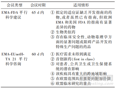 歐洲EMA的平行科學(xué)建議包括EMA?FDA平行科學(xué)建議(EMA?FDA Parallel Scientific Advice,EMA?FDA PSA)和歐洲EMA與歐洲衛(wèi)生技術(shù)評估網(wǎng)絡(luò)21聯(lián)盟平行科學(xué)咨詢(Parallel EMA/EUnetHTA 21 Joint Scientific Consultation,EMA?EUnetHTA JSC),申請人可以同時獲得多方的意見反饋。2種平行科學(xué)建議的時限和適用情形見表6。