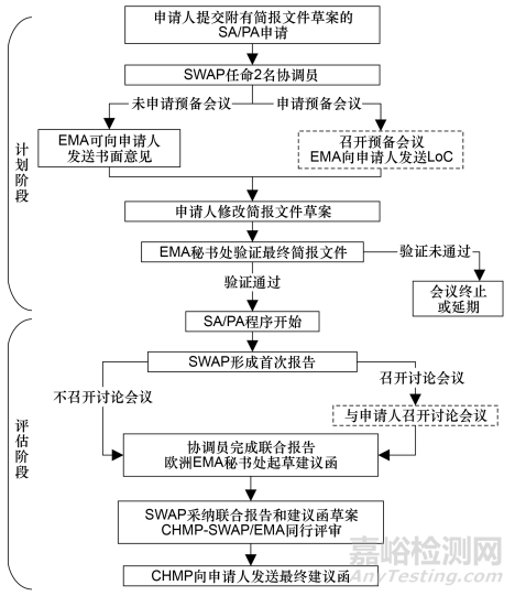 申請人向歐洲EMA秘書處提交SA/PA申請并發(fā)送簡報文件草案。自收到SA/PA申請起,歐洲EMA秘書處向SAWP提交申請,要求任命2名協(xié)調(diào)員。每個協(xié)調(diào)員組成一個評估小組,各自準備1份關(guān)于科學(xué)問題的報告和問題清單。歐洲EMA審評申請人提交的簡報文件草案,并確認額外的專家/患者代表。申請人可以選擇組織一次預(yù)備會議,若召開,則歐洲EMA將編寫意見一覽表(list of comments,LoC)并發(fā)送給申請人;若不召開,歐洲EMA可將意見以書面形式發(fā)送給申請人。最后,申請人根據(jù)相關(guān)意見修改并提交簡報文件,歐洲EMA秘書處對最終簡報文件進行驗證。