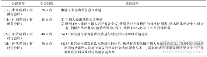 BsUFA會議分為生物類似藥初步咨詢(bio?similar initial advisory,BIA)會議、生物類似藥開發(fā)(biosimilar biological product development,BPD)1~4類會議。BsUFA會議的類型、時限和適用情形見表3。