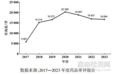 ▲圖5-2017-2023 年 CDE 接收一般性技術(shù)問題咨詢量