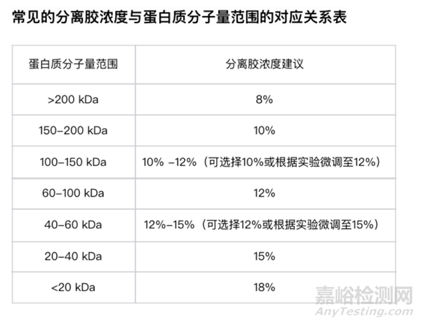 在SDS-PAGE電泳中,分離膠濃度是一個(gè)至關(guān)重要的參數(shù),直接影響著蛋白質(zhì)的分離效果。濃度越高,孔徑越小,越適合分離小分子蛋白質(zhì);濃度越低,孔徑越大,越適合分離大分子蛋白質(zhì)。以下是我們總結(jié)的一個(gè)常見凝膠溶液濃度與蛋白質(zhì)分子量范圍的對(duì)應(yīng)關(guān)系表:(僅供參考)