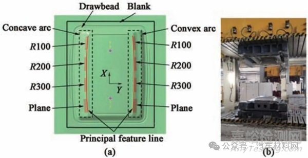 基于上述理論分析, 為了研究滑移線對外覆蓋件產品(涂裝狀態(tài)) 外觀感知品質的影響, 并探尋相應的新評判方法, 本文設計一種滑移線試驗模型,如圖2a 所示, 通過兩側的拉延筋控制滑移線的距離, 圖2b 為試驗模型的模具實物。