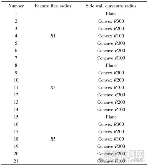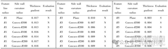 Tab.5 Evaluation results of appearance quality at feature lines of painted parts with different feature line radius and side wall curvature radius