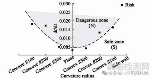 式中:y 為料厚變化梯度; x 為側壁曲率半徑。圖9所示為擬合后的滑移線感知風險臨界線(虛線),位于臨界線以上為棱線外觀品質危險區(qū)域, 臨界線以下為安全區(qū)域, 以此形成滑移線感知風險評價圖?;谠搱D, 只需要通過CAE 方法計算獲得棱線滑移區(qū)域的料厚變化梯度及側壁曲率半徑, 即可得出實際成品滑移線感知風險情況。