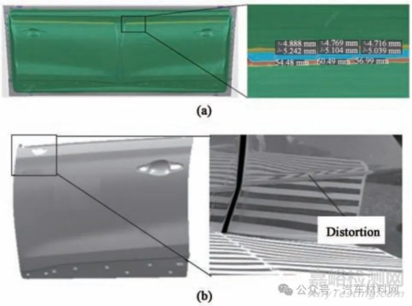 圖12 門外板棱線處CAE 分析結果(a) 及產品光影情況(b)