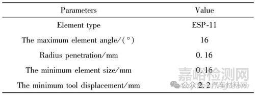 滑移線缺陷試驗的CAE 仿真模型通過Autoform軟件建立, 如圖4 所示(圖中箭頭表示凹模和壓邊圈的運動方向), 其中壓邊圈行程120 mm, 壓邊力1000 kN, 摩擦因數定義為0.15。采用自適應拉延筋, 由于模型存在小半徑棱線, 為了提高仿真的準確度, 網格單元分析參數按表3 進行設置。