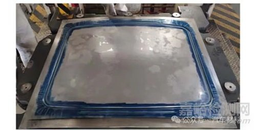 為了使實際生產與CAE 分析狀態(tài)盡可能趨于一致, 模具的研合率需達到85%以上, 同時嚴格按CAE 分析工藝參數來進行調試, 避免因為制造的因素導致實際成形狀態(tài)與理論不匹配。本次試驗所用模具壓料面的研合情況如圖5 所示, 由圖可知, 研合率已達85%以上, 滿足調試要求。