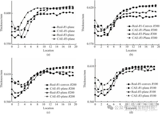 圖7所示為部分不同棱線圓角半徑及側壁曲率半徑狀態(tài)下樣件的實測料厚值及對應的CAE 分析值。從圖中可以看出, 從圓角根部開始, 樣件的料厚發(fā)生急劇變薄之后, 沿著遠離圓角的方向緩慢增厚, 呈現拋物線特征, 結合表4 可以看出, 料厚急劇變化的區(qū)域均處于滑移線距離范圍內, 這與前面分析的不均勻塑性變形現象一致, 而這種料厚的變化不均程度, 也是影響滑移線缺陷是否可被感知的本質因素, 可作為評估滑移線缺陷可被感知風險評價的手段, 這也與文獻[10] 的研究結論一致。