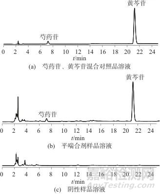 取混合對照品溶液、平喘合劑樣品溶液、陰性樣品溶液,按照1.2儀器工作條件測定,以色譜峰面積外標法計算芍藥苷及黃芩苷的含量。