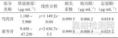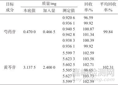 取芍藥苷對照品溶液、黃芩苷對照品溶液,用甲醇逐級稀釋,以信噪比(S/N)為3∶1時對應的溶液中目標物的質量濃度為方法檢出限,以10∶1時對應的溶液中目標物的質量濃度為定量限,結果見表2。