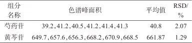 取平喘合劑(批號24022302)樣品6份,制備平喘合劑樣品溶液,按1.2色譜條件進行分析,記錄色譜峰面積并計算芍藥苷及黃芩苷的含量,結果見表3。由表3可見,測定結果的相對標準偏差(RSD)分別為2.07%和1.29%,說明該方法精密度良好,滿足測定要求。