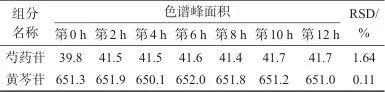 取平喘合劑(批號24022302),制備平喘合劑樣品溶液,分別于第0、2、4、6、8、12、24 h進樣測定,記錄色譜峰峰面積并計算相對標準偏差,具體結果見表4。由表4可見,樣品溶液在24 h內穩(wěn)定性良好。