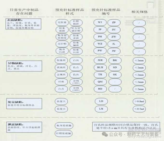 預(yù)充針標(biāo)準(zhǔn)樣品在預(yù)充針式注射器全自動燈檢機的使用中起到重要作用,預(yù)充針標(biāo)準(zhǔn)樣品的種類需要包含在生產(chǎn)、運輸?shù)冗^程中可能出現(xiàn)的種種影響預(yù)充針灌裝制品生產(chǎn)質(zhì)量的因素,因此預(yù)充針標(biāo)準(zhǔn)樣品的確認(rèn)在預(yù)充針式注射器全自動燈檢機的驗證以及在生產(chǎn)過程中的使用都具有十分重要的意義。