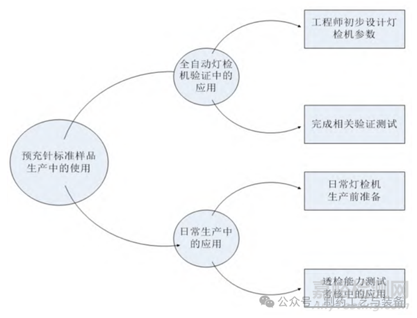 如圖2所示,預(yù)充針注射劑標(biāo)準(zhǔn)樣品在生產(chǎn)的應(yīng)用主要分為兩個步驟,首先是預(yù)充針標(biāo)準(zhǔn)樣品在全自動燈檢機驗證過程的應(yīng)用,其次是針對標(biāo)準(zhǔn)樣品在日常生產(chǎn)中的應(yīng)用。