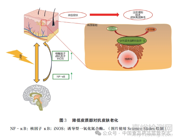 皮質醇主要源于腎上腺皮質, 通過響應下丘腦 -垂體 -腎上腺(HPA)軸激活產(chǎn)生,并與糖皮質激素受體結合起作用[33]。下丘腦神經(jīng)元會分泌促腎上腺皮質激素釋放激素(corticotropin releasing hormone, CRH), 皮膚細胞也可產(chǎn)生CRH、ACTH 及各種受體,組成功能齊全的外周HPA 軸。壓力應激促使CRH 釋放誘導皮膚細胞產(chǎn)生皮質醇,破壞皮膚穩(wěn)態(tài)、降低屏障功能以及誘發(fā)炎癥等[34]。UV 照射或情緒壓力等應激上調11β -羥基類固醇脫氫酶1 型(11β -hydroxysteroid dehydrogenase type 1,11β -HSD1)的表達,11β -HSD1 將無活性可的松轉化為生物活性皮質醇,導致角質形成細胞生長抑制、基質金屬蛋白酶活化、NF - κB 激活等,使皮膚傷口愈合延遲、膠原蛋白含量下降、促炎細胞因子釋放以及活性氧(reactive oxygen species,ROS)水平升高并引起氧化應激[35]。阻斷11β -HSD1 活性可幫助皮膚平衡皮質醇水平,提高真皮膠原蛋白合成、增強屏障功能,恢復穩(wěn)態(tài)并抵抗皮膚衰老[4,36]。降低皮質醇對抗皮膚老化過程詳見圖3。