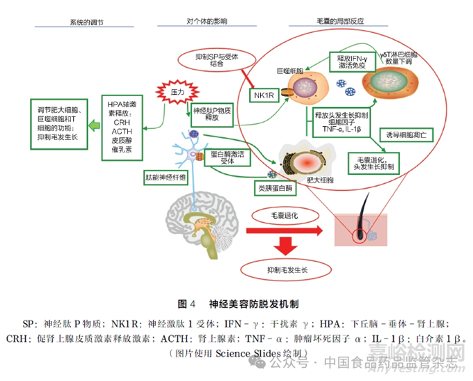 毛囊(hair follicle,HF)是皮膚上的一種微型器官。通過控制毛發(fā)周期的休止期、生長期、退行期三個階段能夠調節(jié)毛囊干細胞生長發(fā)育過程[42]。在神經(jīng)內分泌 -免疫相互作用中,壓力應激會改變免疫反應,而免疫細胞及免疫調節(jié)因子都顯著影響毛囊活性與毛發(fā)生長周期。壓力應激會抑制毛發(fā)生長并導致毛囊退化[43]。許多患者在遭遇重大壓力后出現(xiàn)斑禿癥狀,而斑禿是一種自身免疫性疾病,與毛囊周圍神經(jīng)纖維中豐富的SP 表達有關[44]。中樞應激反應可激活HPA 軸, 沿該軸釋放的CRH、ACTH 和糖皮質激素等均有抑制毛發(fā)生長作用。中樞應激刺激肽能神經(jīng)纖維分泌SP,激活SP 受體,誘導毛囊凋亡,并使退行期毛囊數(shù)量增多;肥大細胞分泌的蛋白酶(如類胰蛋白酶)可進一步激活肽能神經(jīng)纖維上的蛋白酶激活受體(protease activated receptors,PARs),通過正反饋觸發(fā)額外神經(jīng)肽釋放,隨后通過毛囊的免疫細胞分泌炎性細胞因子(如TNF -α、IL -1β)抑制頭發(fā)生長;毛囊周圍巨噬細胞浸潤會攻擊毛囊干細胞, 破壞其再生能力[43]。因此,針對神經(jīng)因素,抑制神經(jīng)肽P 物質的作用可作為一種防脫發(fā)策略。