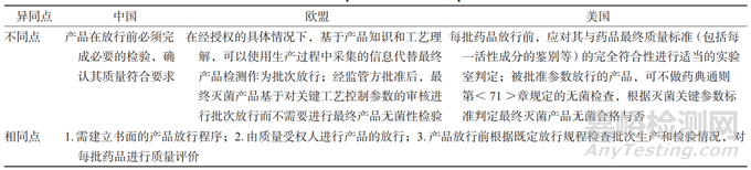 產(chǎn)品放行是質(zhì)量保證的重要環(huán)節(jié)之一,中國(guó)、歐盟和美國(guó)均規(guī)定了對(duì)無菌產(chǎn)品的放行要求,其異同點(diǎn)比較如下。