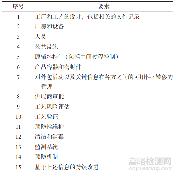 根據(jù) PDA 第 90 號(hào)技術(shù)報(bào)告《藥品生產(chǎn)中的污染控制策略開發(fā)》[8],CCS 文件應(yīng)包括污染物的潛在進(jìn)入點(diǎn)和擴(kuò)散點(diǎn)、污染物的去除和減少能力、污染事件歷史、微生物和病毒屬性、無菌處理、工藝和設(shè)備設(shè)計(jì)以及清潔、消毒和滅菌原則的技術(shù)知識(shí)總結(jié),還應(yīng)考慮原材料質(zhì)量和質(zhì)量風(fēng)險(xiǎn)管理原則。這些要素對(duì)于防止生產(chǎn)過程的每個(gè)步驟中的污染至關(guān)重要,其要素包括:
