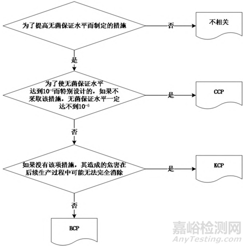參數(shù)放行是以生產(chǎn)過程工藝相關(guān)數(shù)據(jù)審核為基礎(chǔ)的放行系統(tǒng),因此根據(jù)藥品和滅菌工藝的特性評(píng)估合適的關(guān)鍵參數(shù)并制定參數(shù)放行標(biāo)準(zhǔn)是至關(guān)重要的。根據(jù)控制點(diǎn)對(duì)無菌保證水平的影響程度,參數(shù)放行的參數(shù)可分為關(guān)鍵控制點(diǎn)(CCP)、重要控制點(diǎn)(KCP)和基礎(chǔ)控制點(diǎn)(BCP)三類。CCP 的評(píng)估可參考圖 1 決策樹進(jìn)行。