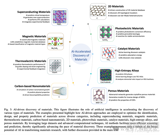 在AI加速材料發(fā)現(xiàn)方面,論文詳細介紹了多種AI模型的應(yīng)用案例。例如,在超導(dǎo)材料領(lǐng)域,AI模型被用于預(yù)測材料的超導(dǎo)轉(zhuǎn)變溫度(T_c),并通過生成對抗網(wǎng)絡(luò)(GANs)等生成模型探索新的超導(dǎo)材料。在磁性材料、熱電材料、碳基納米材料、二維材料、光伏材料、催化材料以及高熵合金等領(lǐng)域,AI同樣展現(xiàn)出強大的預(yù)測和設(shè)計能力。