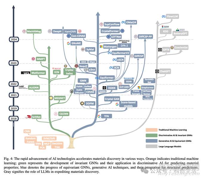 此外,論文還討論了AI技術(shù)在材料數(shù)據(jù)庫構(gòu)建、材料性質(zhì)預(yù)測、材料結(jié)構(gòu)生成等方面的應(yīng)用。通過結(jié)合深度學(xué)習(xí)、圖神經(jīng)網(wǎng)絡(luò)(GNNs)等先進算法,AI模型能夠處理和分析復(fù)雜的材料數(shù)據(jù),揭示材料性能的內(nèi)在規(guī)律,為新材料的設(shè)計和開發(fā)提供有力支持。