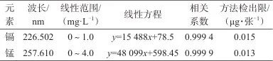 根據(jù)GBZ/T 300.6—2017《工作場(chǎng)所有毒物質(zhì)測(cè)定 第6部分:鎘及其化合物》和GBZ/T 300.17—2017《工作場(chǎng)所有毒物質(zhì)測(cè)定 第17部分:錳及其化合物》規(guī)定,濾膜中鎘和錳金屬分析檢測(cè)方法為原子吸收分光光度法,而實(shí)際樣品往往含有多種金屬,若采用火焰原子吸收分光光度法只能單元素逐一檢測(cè),不但效率低且存在樣品量不夠的問(wèn)題,因此,采用等離子體發(fā)射光譜法對(duì)多元金屬濾膜進(jìn)行定值分析,可以彌補(bǔ)火焰原子吸收分光光度法的缺陷。對(duì)等離子體發(fā)射光譜法分析方法的線性方程、相關(guān)系數(shù)、方法檢出限、準(zhǔn)確度、精密度開(kāi)展評(píng)價(jià)。對(duì)鎘、錳元素系列標(biāo)準(zhǔn)溶液進(jìn)行測(cè)試,以質(zhì)量濃度為自變量對(duì)光譜強(qiáng)度因變量進(jìn)行線性回歸,得到兩種元素的線性方程和相關(guān)系數(shù)。對(duì)1.3.1實(shí)驗(yàn)方法處理的空白濾膜溶液樣品進(jìn)行10次測(cè)試,計(jì)算10次測(cè)定值的標(biāo)準(zhǔn)偏差和定容體積(10 mL)乘積作為方法檢出限。結(jié)果見(jiàn)表1。