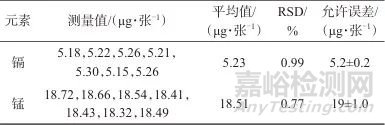 采用標(biāo)準(zhǔn)物質(zhì)GBW(E) 080211進(jìn)行方法準(zhǔn)確度和精密度驗(yàn)證,對(duì)處理后的標(biāo)準(zhǔn)物質(zhì)溶液連續(xù)測(cè)量7次,結(jié)果見(jiàn)表2。由表2可見(jiàn),鎘和錳成分測(cè)量平均值分別為5.23 μg/張和18.51 μg/張,均在允許誤差的范圍內(nèi),檢測(cè)結(jié)果的相對(duì)標(biāo)準(zhǔn)偏差(RSD)分別為0.99%和0.77%,低于GBZ/T 300.6—2017和GBZ/T 300.17—2017中規(guī)定精密度要求,因此,等離子體發(fā)射光譜法作為定值方法可靠性較好。