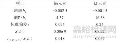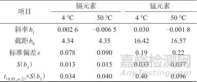 在20 ℃保存條件下,進(jìn)行12個(gè)月連續(xù)監(jiān)測(cè),長(zhǎng)期穩(wěn)定性檢測(cè)結(jié)果見(jiàn)表6和表7,可以看到在質(zhì)控樣品長(zhǎng)期穩(wěn)定性考察數(shù)據(jù)的∣b1∣均小于t (0.95,n-2)×S(b1),質(zhì)控樣品中鎘和錳含量趨于穩(wěn)定,該保存條件下有效期為12個(gè)月。
