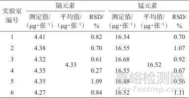 取6家實(shí)驗(yàn)室測(cè)量平均值作為定值結(jié)果,可知,鎘含量測(cè)量平均值為4.33 μg/張,錳含量測(cè)量平均值為16.52 μg/張。